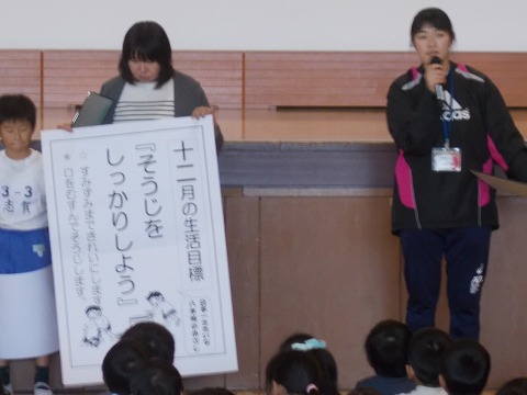 今朝の児童集会は、先日行われたスーパー元気さわやか集会に参加した代表児童による全校児童への発表でした。