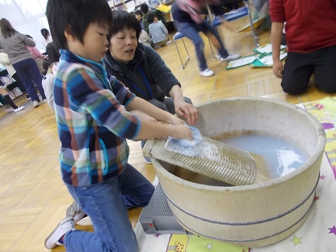 石臼や洗濯板など、今となっては体験することさえ難しい昔の道具を3年生全員が体験することができました。
