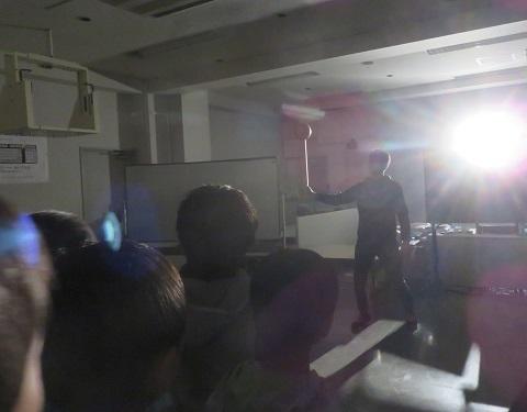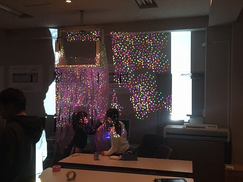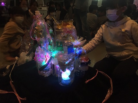 4年生が、図工「ゆめいろランプ」で作った作品に、LEDライトを照らして、暗闇の中幻想的な風景を味わいました。