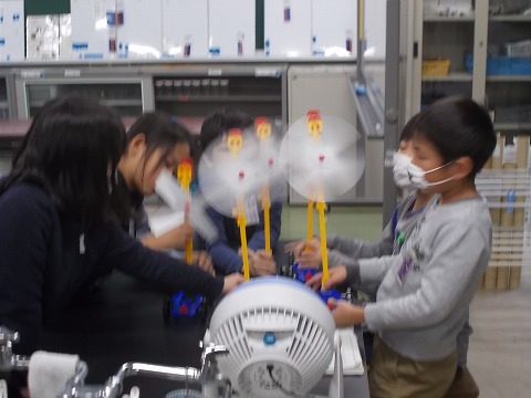 自分の作った風車をサーキュレーターで回します。本当は、弱い風と強い風で、回る速さや音の違いを確かめる学習なのですが、子どもたちは回った風車に大喜び。これも大人でも楽しめます。