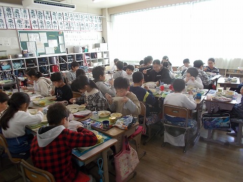 縦割り班で食べるなかよし給食のカレーは一味も二味もちがいます。