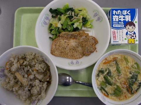今日の給食は、かて飯、牛乳、豚肉のごま焼き、小松菜としめじのおひたし、かきたま汁 でした。