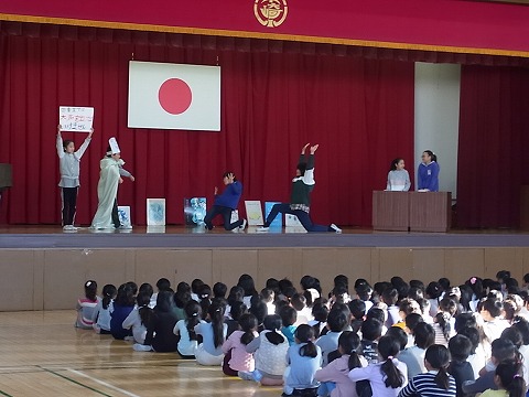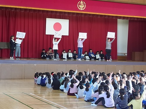 今朝の児童集会は、図書委員会と給食委員会の委員会発表でした。