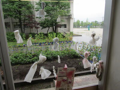 雨が続いています。1年生の教室で、ティッシュペーパーで作ったテルテル坊主を見つけました。