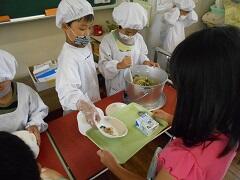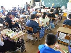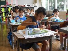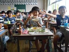 6月9日の給食開始から2か月たらずで、1年生も配膳が上手になりました。本当はみんなと楽しみながら会食をしたいところですが、そこはがまんです。かわりにじっくり味わって食べています。
