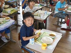 今日は1学期の給食最終日でした。最終日の献立は、みんな大好きカレーライス。市販のルゥを使うのではなく、スパイスの段階から作る「特製八木小カレー」です。食べていると、自然と笑顔になっています。
