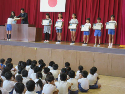 科学展、発明創意工夫展に加え、春日部市小学生ロボットコンテストの入賞者、「WE LOVE トンボ」絵画コンクールの入賞者が校長先生から賞状を受け取りました。