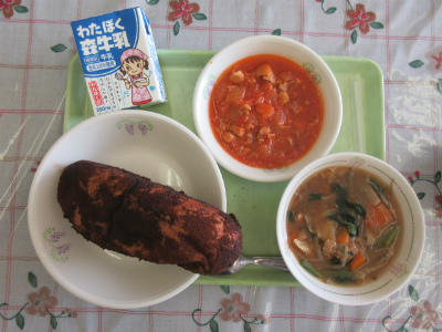 今日の献立は、とり肉のトマト煮、ワンタンスープ、ココア揚げパン、牛乳です。人気メニューということもあり、今年度は参加者多数となりました。