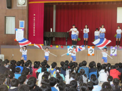 昼休み、体育館で器械体操クラブ、リズムダンスクラブ、バトンクラブ、金管バンドクラブの発表がありました。