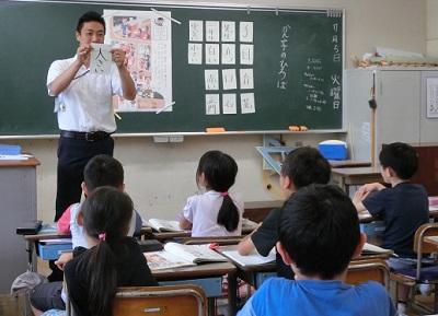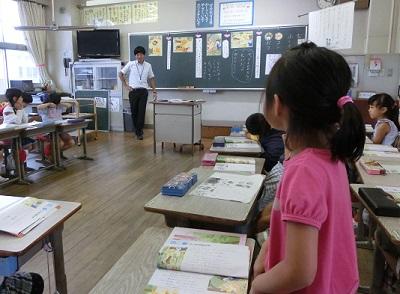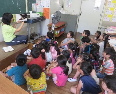 教科書の教材に関連する本を担任の先生が読み聞かせていました。みんな集中して聞いていました。