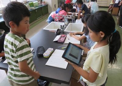 理科室に行くと、5年生が顕微鏡を使って何かを観察中。聞いてみると、校地内にある池の水をとってきて微生物を見ているとのこと。教科書に出てくるような微生物が見つかったかな?