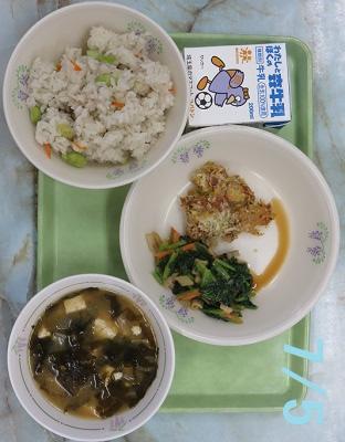 本日の献立は、枝豆ご飯、鶏肉の香味焼き、青菜とかんぴょうの和え物、味噌汁、牛乳でした。本日もおいしい給食を提供していただきました。感謝。