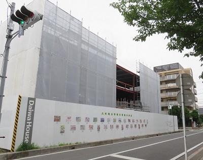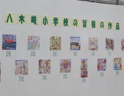 学校近くの工事現場の壁に八木崎小学校の児童が描いた絵画が飾られました。施工業者のご厚意で、約30点の作品が掲示されました。車に気をつけて鑑賞してください。