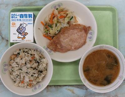 本日の献立は、わかめご飯、豚肉のオイスターソース焼き、キャベツの辛子和え、こしね汁、牛乳でした。