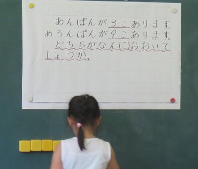 1年生の算数の授業風景です。もう、こんな難しい問題を解いているのです。「分かっていることは?」「聞かれていることは?」「単位は?」ということを全員で確認してから個別に考える時間を確保していました。もちろん、まだ、ブロックを使いながら考えています。
