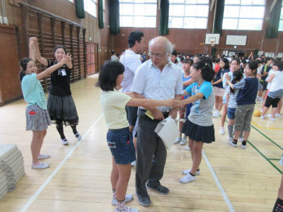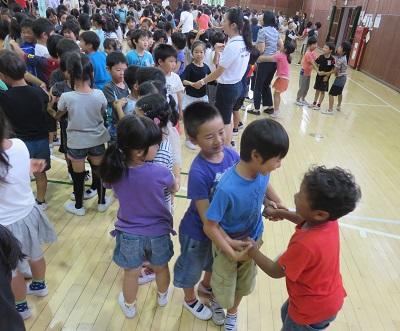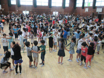 全校児童が一斉に「木の中のリス」というゲームを楽しみました。途中からは、先生たちもゲームに参加していました。