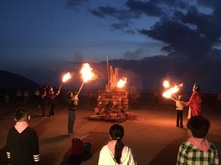 火の神が八木崎の火をたずさえてやってきました。子どもたちは「努力の火」「健康の火」「友情の火」「希望の火」に分けてもらいました。
