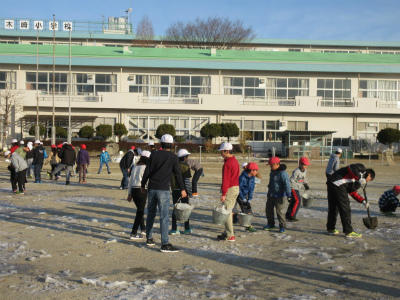 先週降った校庭の雪は少なくなってきましたが、朝になると凍結してしまいます。そこで、高学年の児童が少しずつ片付けています。