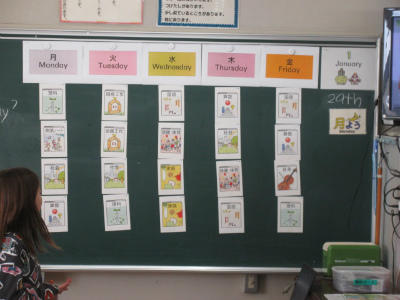 5年生の授業です。JTEの先生とともに教科を表す英単語などを学習していました。