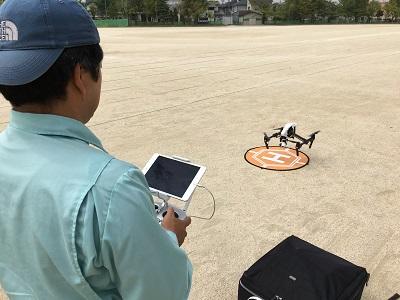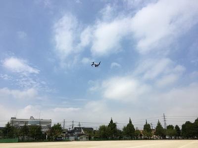 その際、使ったのがドローン。50cm四方くらいある大きなものです。タブレットPCと連動していて、上空からの映像が見えました。サーモスタットカメラで、地上から40m位の高さで飛行して地表の温度を測るとのこと。土の面と芝生がある面では、10度前後の差が出ているそうです。