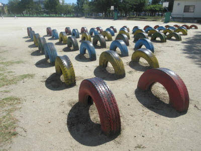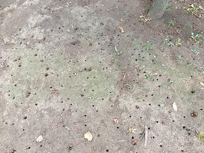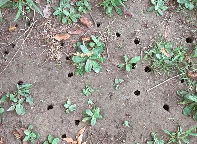 見てください!地面に空いた無数の穴。セミの幼虫が地面から出てきた穴です。校地内に数百個空いています。(千の桁にも・・・?)
