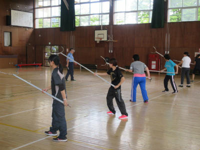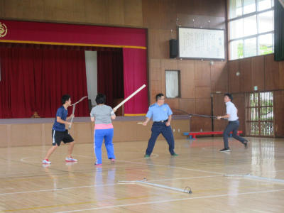 はじめは「さすまた」の使い方についての研修です。春日部警察署の方をお招きし、さすまたの効果的な使用法について教えていただきました。いきなり不審者を取り押さえるのは難しいそうです。適度な距離を保ちつつ、子どもたちを避難させます。