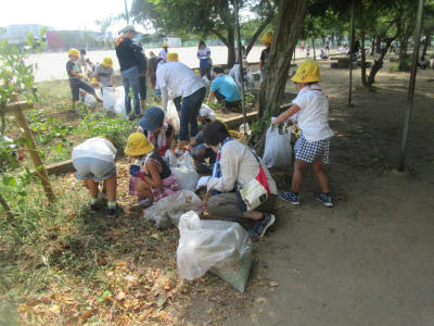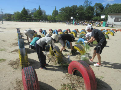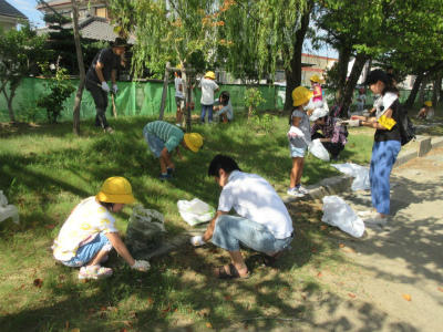 八木崎小の敷地は広いので、たくさんの人数が必要です。そこで、学年ごとに分かれてとりかかりました。