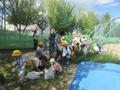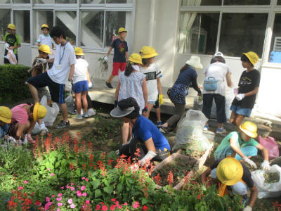 朝からぐんぐん気温が上昇し始める中、1年生から6年生までの児童と保護者の方、教職員が協力して除草を行いました。また、たくさんの地域の方が応援に来てくださいました。