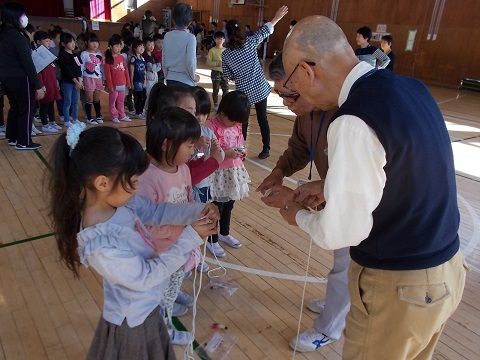 54名のふれあい大学の方に来ていただき、コマ回しや紙鉄砲、羽根つきなど、昔の遊びをたくさん教わりました。