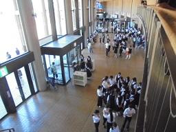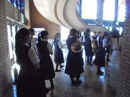 では、そのコンクールの写真です。ただし、演奏中の撮影はムービーもスチールも禁止ですから、会場の様子と、演奏を終えてほっとして、ホール入口に集まっている吹奏楽部の皆さんの様子をどうぞ。