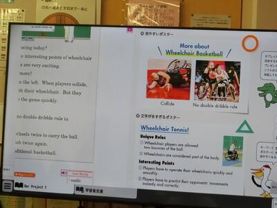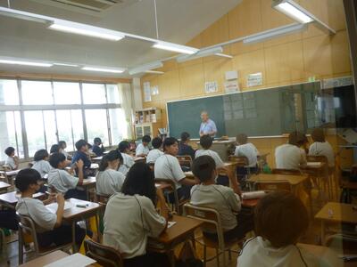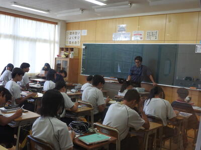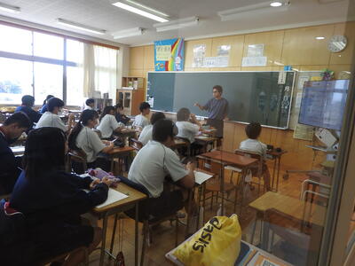 ALTの先生がアメリカの金魚すくいの話をしている場面