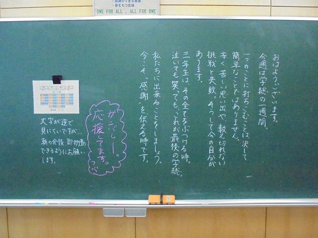 今朝、3年3組の黒板に掲示されていた教育実習生からのメッセージです。