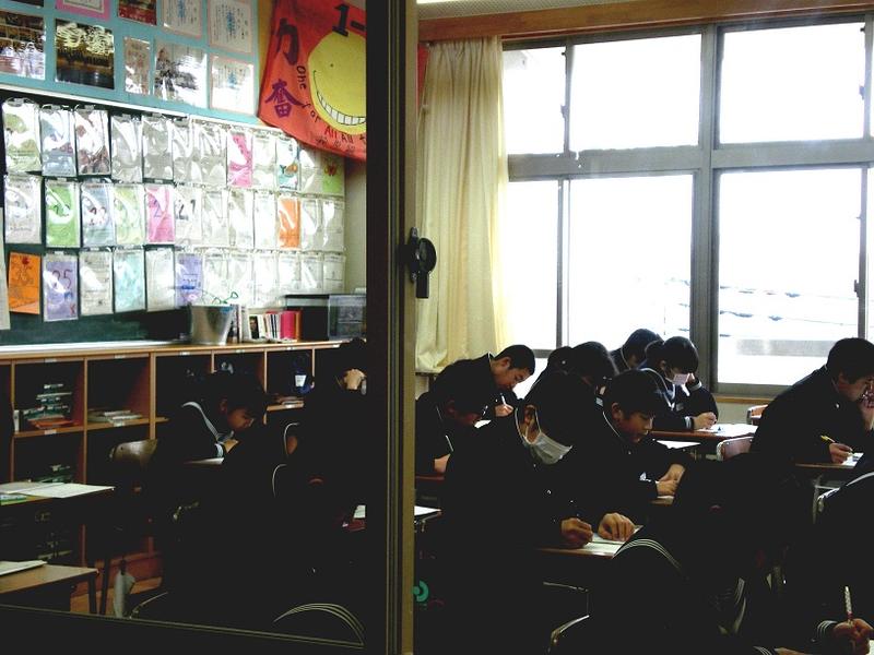 今朝、1年2組、インフルエンザが確認された生徒は9人、そのほかの5学級のインフルエンザの合計は2名。そのため、朝の会終了後、1年2組は下校。明日はお休みです。木曜日からのスキー学校は体調が良好のみの生徒を参加可とします。他の学級は通常日課。スキー学校も予定通り実施します。ただし、スキー学校終了するまでは、部活動を中止とします。
