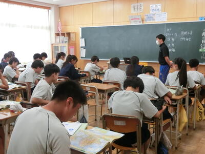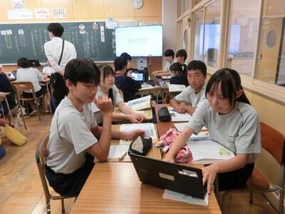 リチウムイオン電池のメリットについて先生の話を聞いている様子