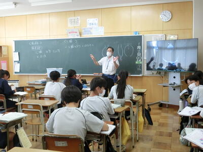 循環系や心臓の仕組みについて先生の話をきいている場面