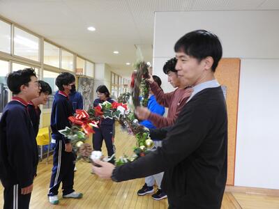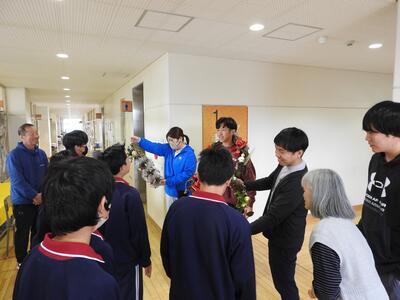 授業で栽培したサツマイモのツルを活用して作ったクリスマスリースを先生方に贈りました。