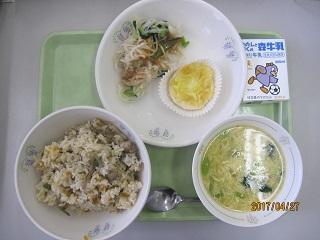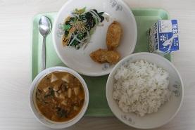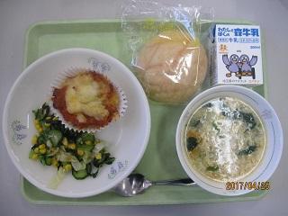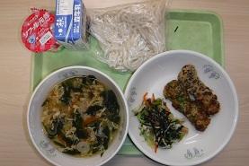 かき玉うどんに、揚げた2種類のチクワがマッチした絶妙のバランスで、おいしくいただけました。野菜もたくさん食べられて、さらにヨーグルトと牛乳という乳製品が2つもある、実に栄養満点の給食です。