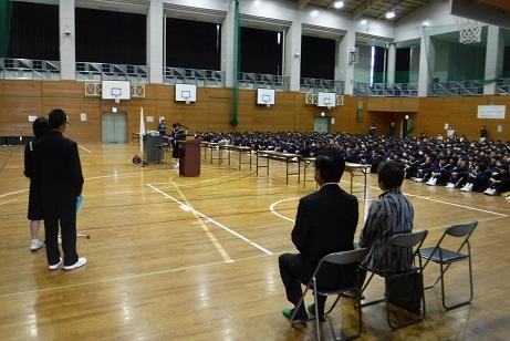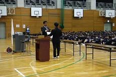全校生徒にバッジをいただきます。 右は生徒会長誓いの言葉です。