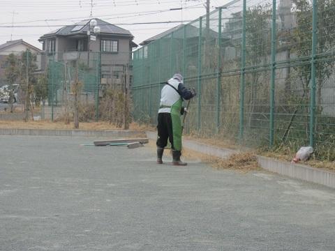 今日は、テニスコートまわりの雑草を草刈り機で刈ってから、ホウキで集めますとお話されていました。