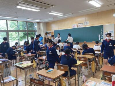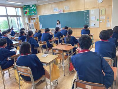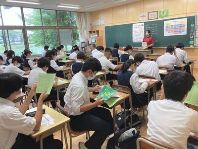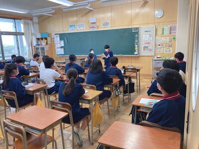 写真は先生がスピーチのお手本をみんなに見せている場面です。