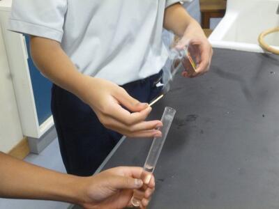 先生「試験管を持つときは上のほうを挟んでください」