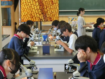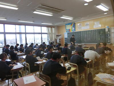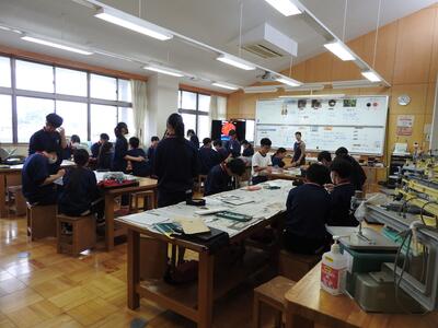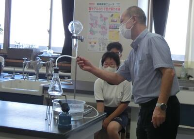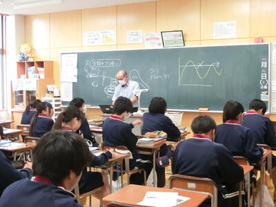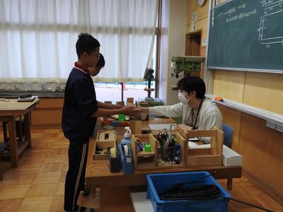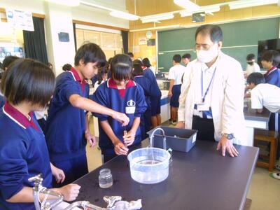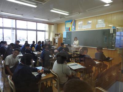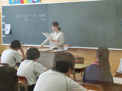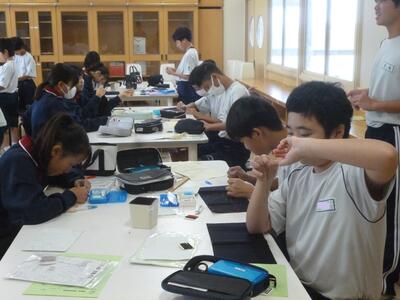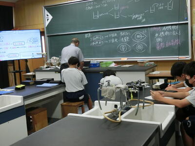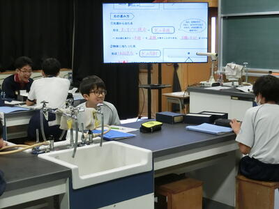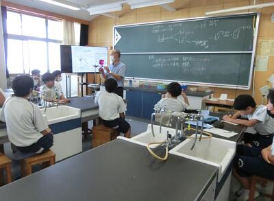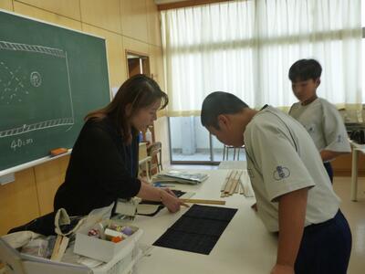 リチウムイオン電池のメリットについて先生の話を聞いている様子
