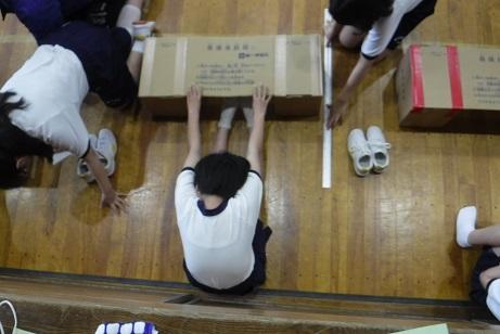 シートを敷いたら、間の空気を抜きます。バスケットボール部の大活躍です。
