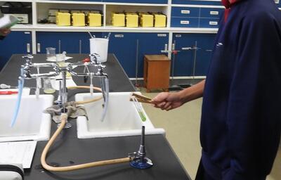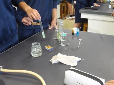 先生「試験管を持つときは上のほうを挟んでください」