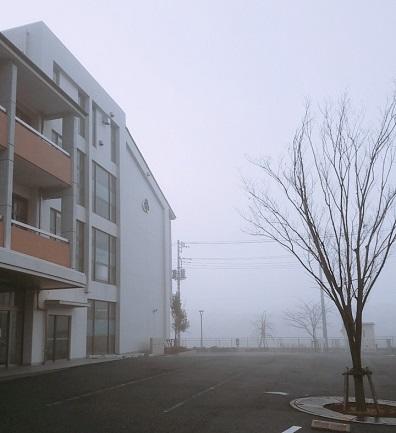 今朝の学校の様子です。濃霧に包まれていつもと違った表情です。撮影したのは8時45分ですが朝練で早かった生徒たちはもっと神秘的に見えたのではないでしょうか?
