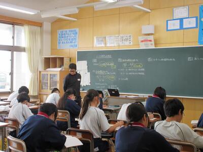 班のみんなで意見交換をした内容を黒板に書いてまとめています。