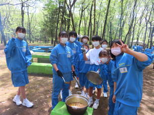 いよいよ野外炊飯、カレーづくりが始まりました。火起こしがなかなかできずに苦労していた班もありましたが、そこは「へこたれない」精神でがんばりました。最後には、全ての班が火起こしに成功しました。他にもお米を研ぐ人、野菜を切る人など、それぞれが責任を持って自分の仕事をしています。