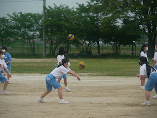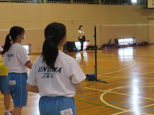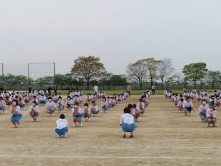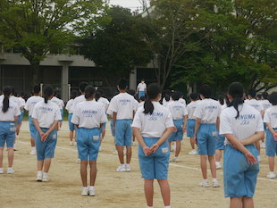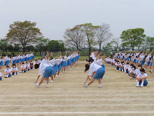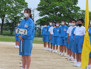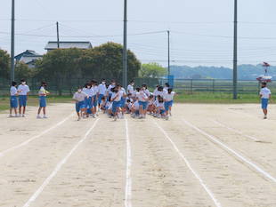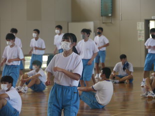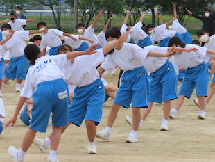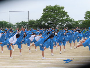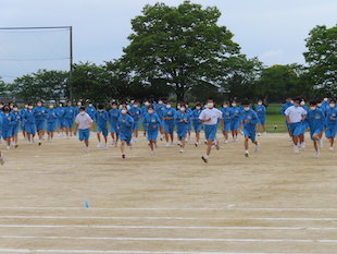 最後に全校生徒で演技となった時、3年生の中から朝礼台で演技するリーダーを募りました。最初は、みんな躊躇していましたが、やがて生徒のひとりが「やります!」と大きな声で返事をし、朝礼台に上り、リーダーとして立派に全校生徒をリードしてくれました。朝礼台での演技が素晴らしかったのはもちろんのことですが、私が感心したのは、列の後方にいたその生徒が、全力疾走で朝礼台にやってきて、演技が終わるとまた全力疾走で自分の場所へ戻ったことです。その動きを見て、とても清々しい気持ちになりました。またひとつ飯沼中の良さを見つけました。