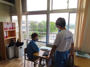 本日は、期末テスト2日目でした。今朝も早くから学校に来て最終確認をする「朝活中」の生徒がたくさんいました。試験に対する心意気が伝わってきます。昨日に引き続き猛暑の中でのテスト、今日も半袖短パンでの受験を可としました。日々暑さが続きます。熱中症対策のため、さまざまな対応をさせていただくこともあります。その際は、HP、メール配信等でご連絡させていただきます。ご理解とご協力をお願いいたします。