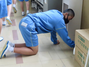 地震の速報が入ると生徒は一斉に机の下に隠れ「サルのポーズ(机の脚を斜めに持ち、両ひざを地面につける姿勢)」で揺れがおさまるのを待ちました。そして、避難指示と共に校庭に避難を開始しました。避難中、私語などなく、全員が真剣に避難をすることができました。